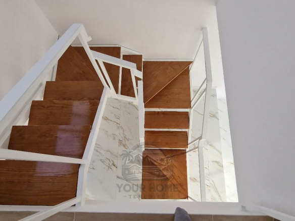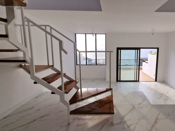 The duplex features a bright and airy open-plan design. The main floor includes a spacious living room, dining area, modern kitchen, and a large terrace. Upstairs, you’ll find the bedrooms and bathrooms, with the master bedroom boasting a private balcony.